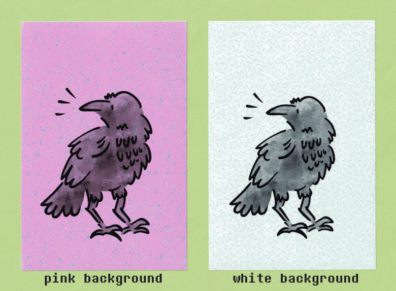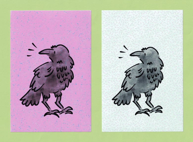 Digital prints of a crow drawn with bold lines and a black/grey wash for the body color. They have little lines coming out from their beak in surprise.